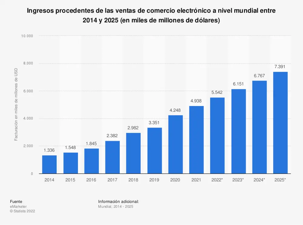 - Las ventas minoristas en todo el mundo, incluidas las compras en tiendas y por Internet, superararon los $22 billones en 2015, un 5,6 % más que en 2014. Las ventas minoristas de comercio electrónico, aquellas compradas a través de Internet, representarán el 7,4 % del mercado minorista total en todo el mundo, o $1,671 billones. En 2019, esa participación aumentó a $ 3,578 billones, pero el comercio electrónico minorista representó solo el 12,8% de las compras minoristas.